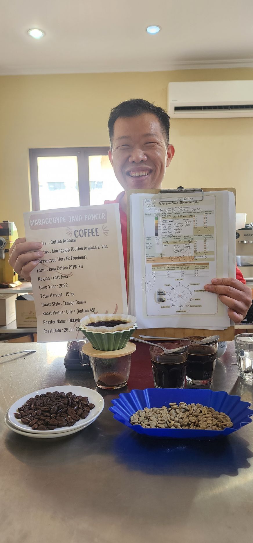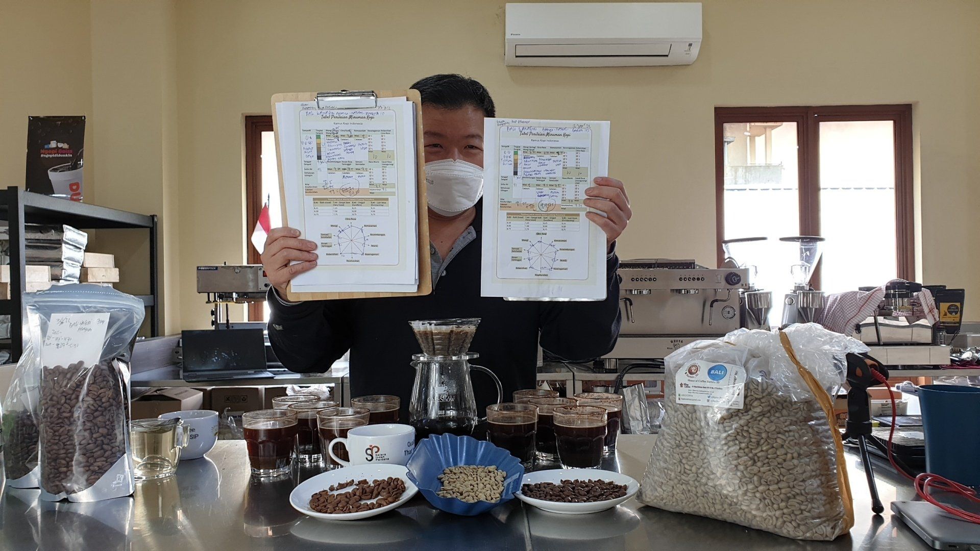 Kamus Kopi received special coffees, Bali Wanagiri arabica from House Barista ID. Bali Wanagiri arabica is authentic coffee from "forest" coffee farm in the district of Buleleng, Balu, Indonesia. Wanagiri village is located about 1220 masl. The district Buleleng itself is located at the northest of Bali island. The main crops from Buleleng are salak (snake fruit), jeruk keprok (mandarin cirtus.) And the name of Wanagiri itself is a combination of two words. Wana means forest. and Giri means hill. (according to Wikipedia.) Besides that, there are many breath taking sites that very good for tourism. Mrs. Yunita from House of Barista informed that this particular beans were selected as favorite one at International event (supported by the Ministry of Trade of Indonesia) in Germany in 2021. The farmers processed the beans in natural, full washed and honey. The cupping scores taken from the event were 83.5, 83.25, and 80. On 7 Jan 2022, Steve of Kopi Presiden roasted the green beans to the color of City roast (Ngebut Kilat style) and to the color of Full City roast (Tenaga Dalam style.) Kamus Kopi reviewed it with SCAA cupping protocol. The cupping notes for the Ngebut Kilat were brown sugar, cinnamon :fragrance, brown sugar, honey :aroma, cinnamon, salted honey :flavors, medium high:acidity, medium:body, pleasant :after taste. The cupping notes for Tenaga Dalam were brown sugar, raisin: fragrance, brown sugar, molasses-fruity: aroma, brown sugar, raisin, cinnamon: flavors, medium high: acidity, medium coating: body, short lingering: after taste. Steve brewed it again with April brewer and paper filter (Suji Premium.) Steve asked Intan to join the review. She tasted the special flavor of orange peel in the coffee. In conclusion, the Bali Wanagiri arabica was a specialty coffee. The Kamus Kopi score was 89.50 for Ngebut Kilat and 89.75 for Tenaga Dalam. For full video, please visit Youtube Kamus Kopi Indonesia, https://youtu.be/yJDLskAsK1A