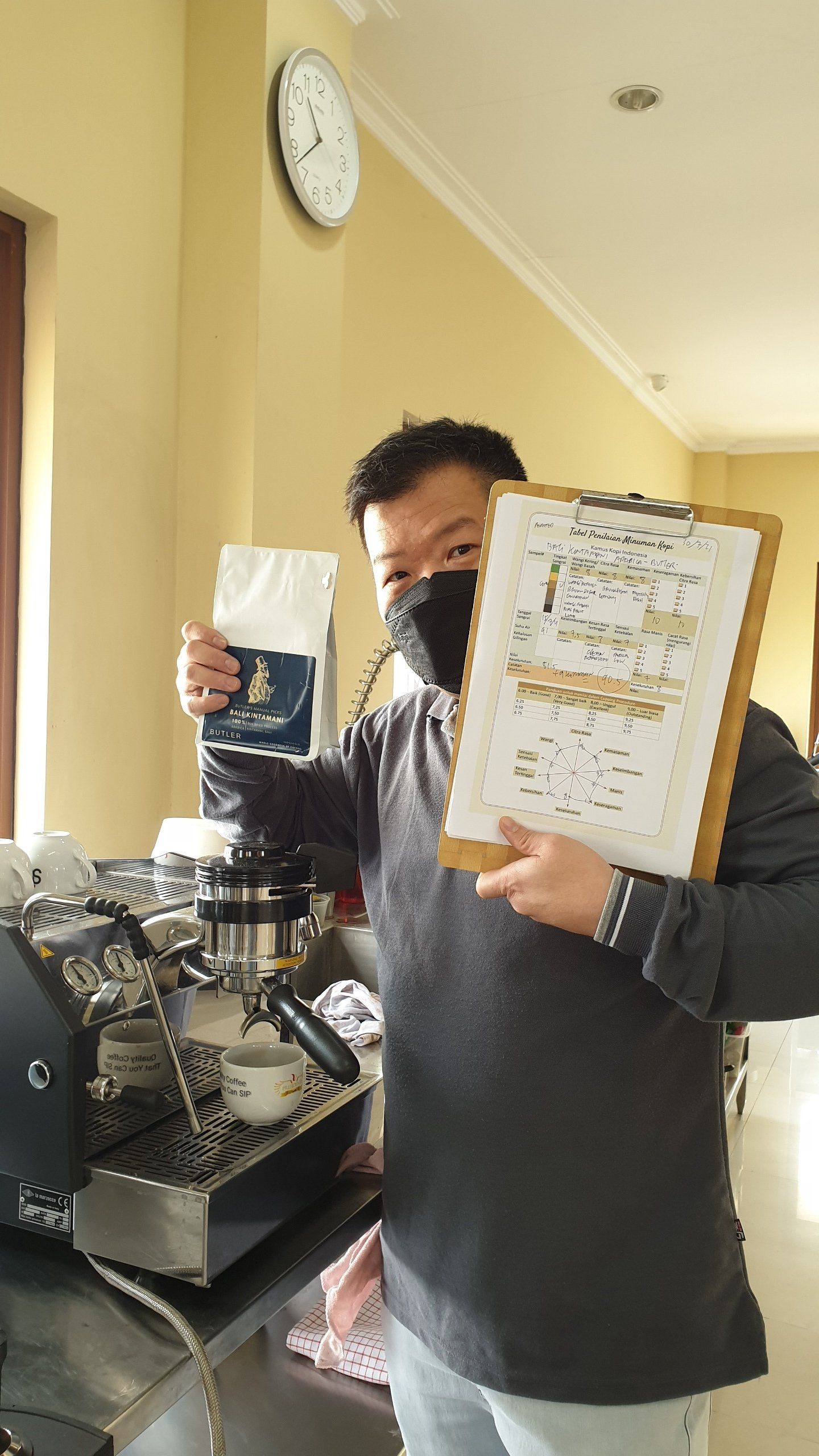 Kamus Kopi received special coffees, Bali Wanagiri arabica from House Barista ID. Bali Wanagiri arabica is authentic coffee from "forest" coffee farm in the district of Buleleng, Balu, Indonesia. Wanagiri village is located about 1220 masl. The district Buleleng itself is located at the northest of Bali island. The main crops from Buleleng are salak (snake fruit), jeruk keprok (mandarin cirtus.) And the name of Wanagiri itself is a combination of two words. Wana means forest. and Giri means hill. (according to Wikipedia.) Besides that, there are many breath taking sites that very good for tourism. Mrs. Yunita from House of Barista informed that this particular beans were selected as favorite one at International event (supported by the Ministry of Trade of Indonesia) in Germany in 2021. The farmers processed the beans in natural, full washed and honey. The cupping scores taken from the event were 83.5, 83.25, and 80. On 7 Jan 2022, Steve of Kopi Presiden roasted the green beans to the color of City roast (Ngebut Kilat style) and to the color of Full City roast (Tenaga Dalam style.) Kamus Kopi reviewed it with SCAA cupping protocol. The cupping notes for the Ngebut Kilat were brown sugar, cinnamon :fragrance, brown sugar, honey :aroma, cinnamon, salted honey :flavors, medium high:acidity, medium:body, pleasant :after taste. The cupping notes for Tenaga Dalam were brown sugar, raisin: fragrance, brown sugar, molasses-fruity: aroma, brown sugar, raisin, cinnamon: flavors, medium high: acidity, medium coating: body, short lingering: after taste. Steve brewed it again with April brewer and paper filter (Suji Premium.) Steve asked Intan to join the review. She tasted the special flavor of orange peel in the coffee. In conclusion, the Bali Wanagiri arabica was a specialty coffee. The Kamus Kopi score was 89.50 for Ngebut Kilat and 89.75 for Tenaga Dalam. For full video, please visit Youtube Kamus Kopi Indonesia, https://youtu.be/yJDLskAsK1A