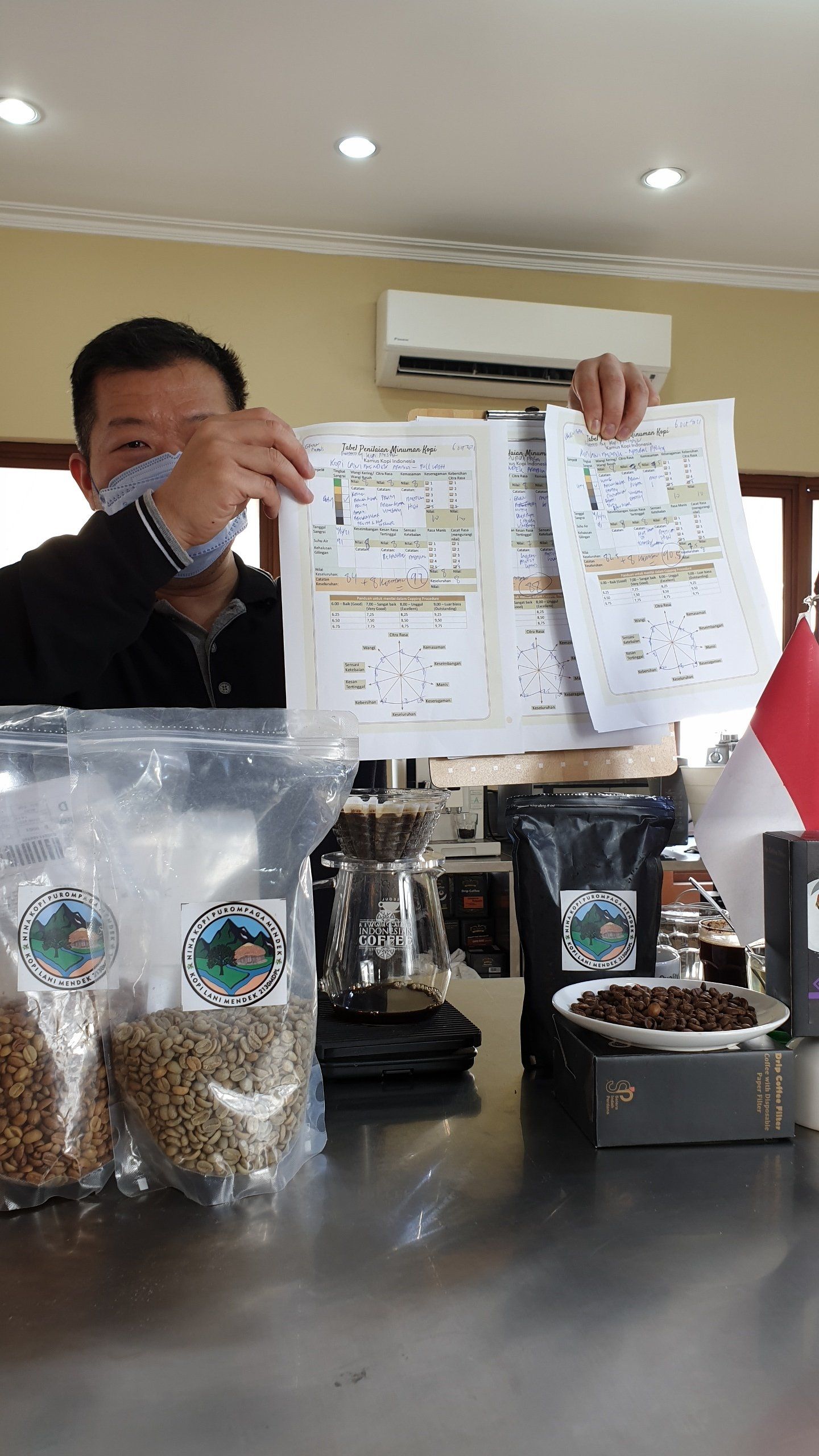 Kamus Kopi received a special coffee, Lani Mendek arabica from Mr. Marsyel. Lani Mendek arabica is authentic coffee from a small coffee farm in the district of Lanny Jaya, Papua, Indonesia. The district Lanny Jaya was established in the 2008. The city of Tiom is the administrative city of Lanny Jaya. The total area of Lanny Jaya is about 6.077 km2 (according to Wikipedia.) The highest elevation is about 4.500 masl. And the average elevation is about 1.700 masl (according to topographic-map.com). Therefore this district is suitable for producing quality arabica coffee. Especially Lanny jaya has fertile soil from the tropical forests. Mr. Marsyel helps his friend in marketing and improving of the coffee. His friend is the coffee farmer. His friend name is Mr. Moses Yigibalom. According to Mr. Marsyel, Mr. Moses's farm still has the original seeds that planted by BPPT in the 1986. The main varieties are kartika, lini S and KT. The main harvest season are in April, June and August. The traditional post harvest processes are fullwash and natural. Currently his farm capacity is about 500Kg in a year. Mr. Moses still need lots of supports especially with the equipment. Mr. Moses is roasting his coffee with sample roaster only. There is a special note printed on the packaging label. It says "Nina Kopi Purompaga Mendek" It has a very authentic meaning, We have coffee from the Mountain. Kamus Kopi received three bags from Mr. Marsyel. One is roasted coffee (roasted by Mr. Moses). Another one is green beans with natural process. And another bag is green beans with full wash process. Bayu of Kopi Presiden roasted the green beans to the color of City roast on the 4th of October 2021. Kamus Kopi reviewed it with SCAA cupping protocol. The cupping notes for the roasted coffee were nutty, cinnamon, fruity :fragrance, fruity :aroma, green, nutty, overripe cherry/vinegary :flavors, medium:acidity, medium low :body, lingering hint of leaf :after taste. The cupping notes for the natural process were brown sugar, earthy, cinnamon: fragrance, fruity & brown sugar: aroma, brown sugar, earthy & vinegary: flavors, medium: acidity, medium high: body, hint of tobacco/cinnamon: after taste. The cupping notes for the full wash process were brown sugar, fruity: fragrance, brown sugar, fruity & hint of flower: aroma, fruity, brown sugar & vinegary: flavors, medium high: acidity, sweet, refreshing: after taste. Steve brewed it again with April glass brewer which manufactured by Suji Bandung. He asked Dea to join the review. According to Dea, the coffee showed thicker body and woody notes. But overall, they all enjoyed this specialty coffee. The Kamus Kopi score was 92 for the full wash, 90,5 for the natu ral, and 88 for the roasted coffee. For full video, please visit Youtube, https://youtu.be/TTZ1Xuvnj4s